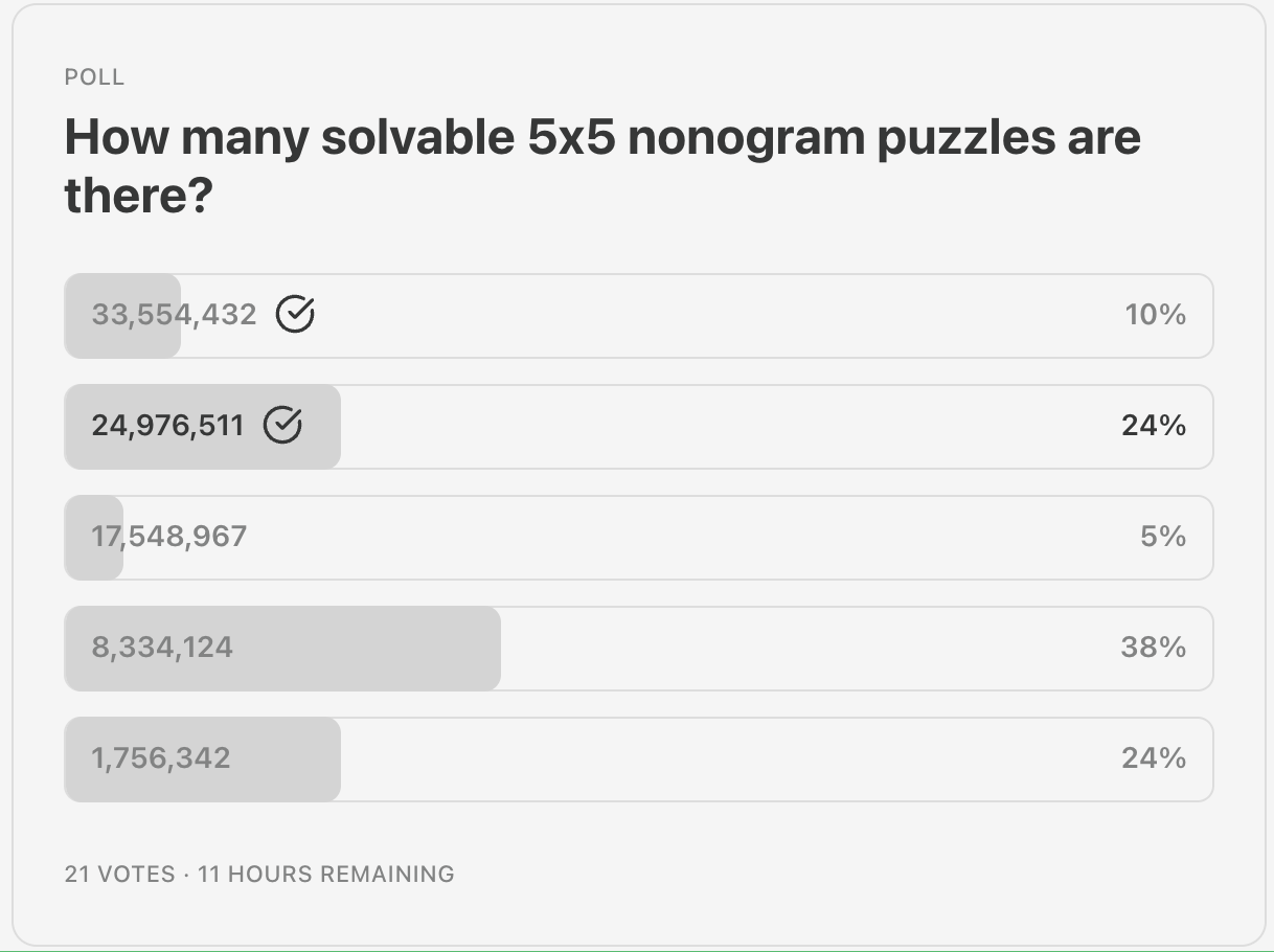 The answer to last week’s poll is 24,976,511 out of 33,554,432 possible 5x5 grids are solvable, or roughly 70%. The most popular choice in the poll was 8,334,124 with 38% of the vote, though 24,976,511 came in second with 24% of the vote.